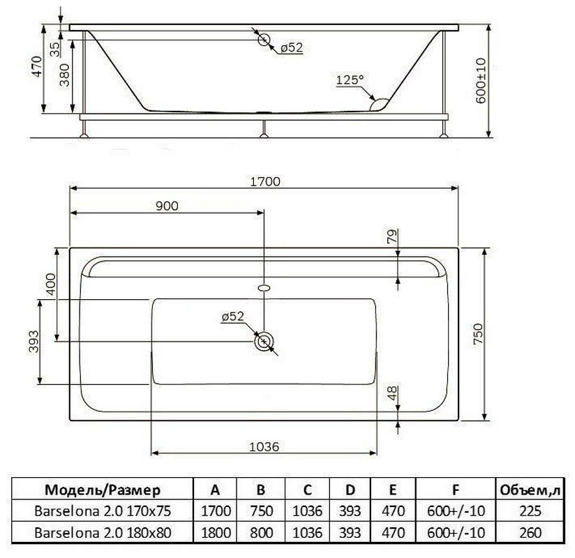 Ванна пристенная Alba Spa Barselona 2.0 Ванна 180х80см, без ножек/рамы, панелей, слива-перелива, (акрил цв.белый), Barselona 2.0 ZZ
