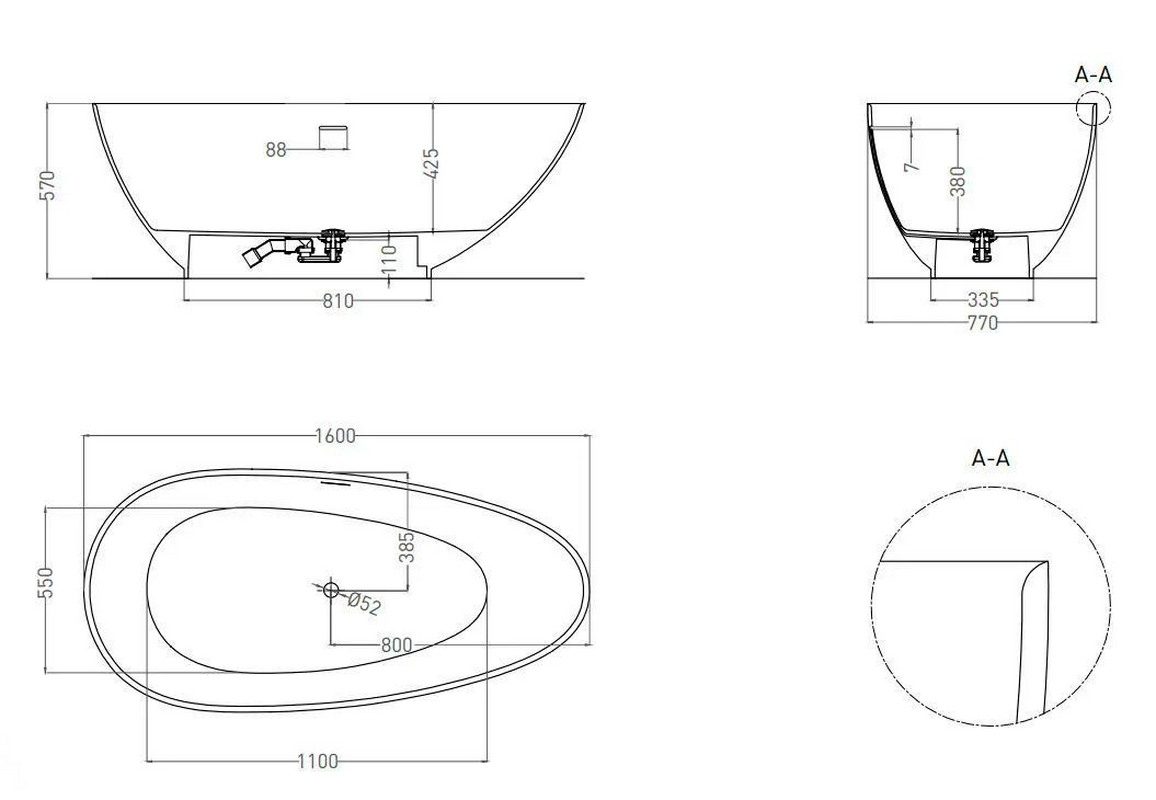 Ванна 1600х770хh570мм, отдельностоящая, литой камень Solix, матовая, нажимн.слив.цв.белый, ОТВЕРСТ.Д/ВЫПУСКА СИФОНА В СТЕНУ, Paola ZZ